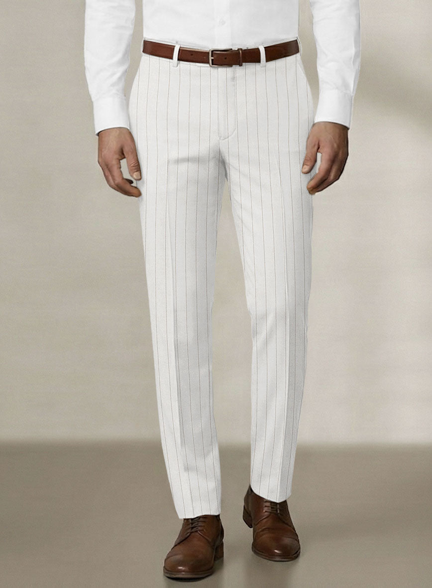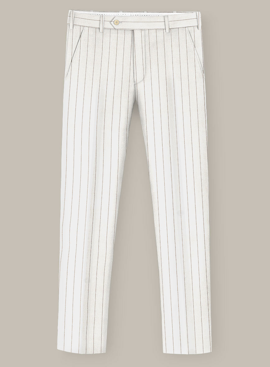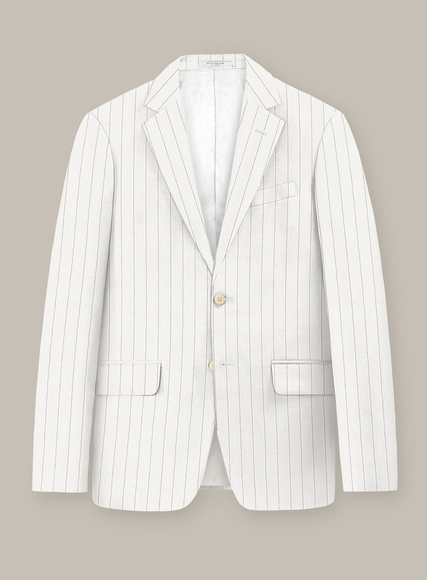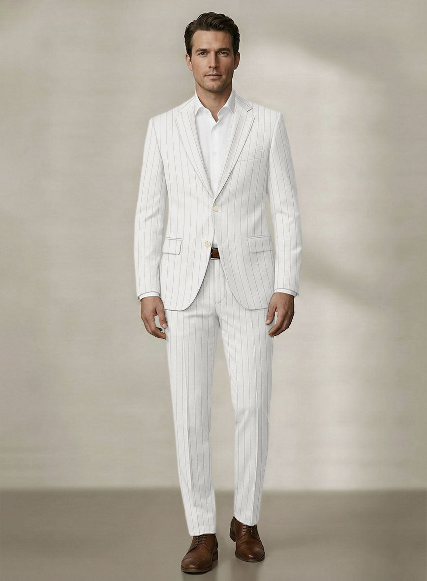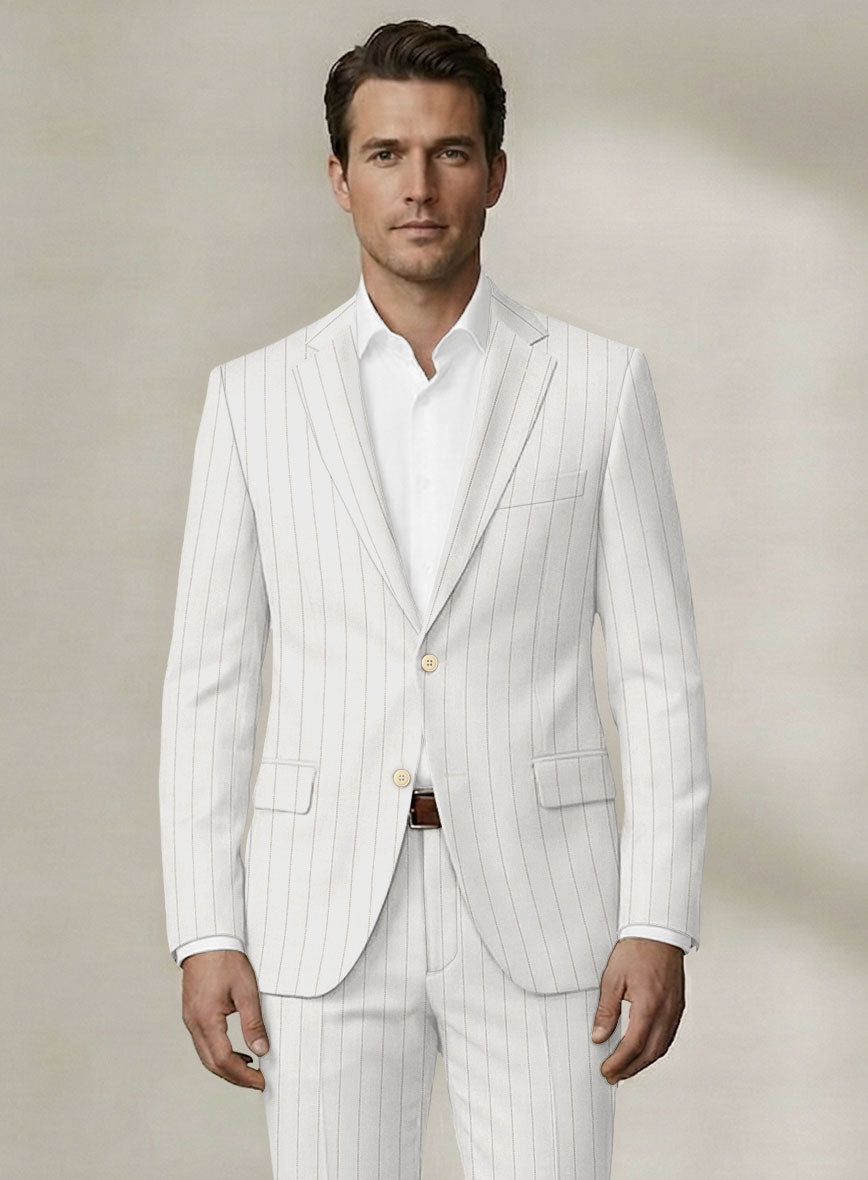 An ode to understated grandeur with our Loro Piana Alvoro Summer Suit. Woven from an exquisite blend of linen, wool, and silk, this pristine white cloth is elevated by slender brown stripes that impart subtle structure. Its airy, hopsack-inspired weave offers breathable ease and refined texture, making it a distinguished choice for seaside ceremonies, summer luncheons, garden soirées, and impeccably polished warm-weather affairs.