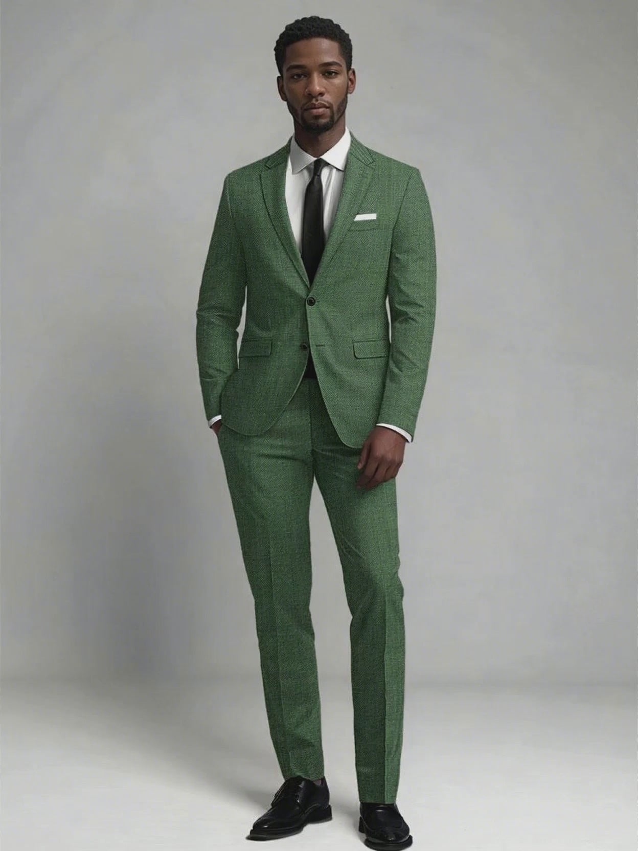 Textured in natural rhythm, the Green Hopsack Suit is tailored from pure wool in a rich green shade that brings depth and character to modern tailoring. Its open weave ensures breathability with a composed touch, combining comfort with structure. Designed to move with ease, this suit transitions seamlessly from professional settings to evening occasions, carrying versatile confidence throughout.