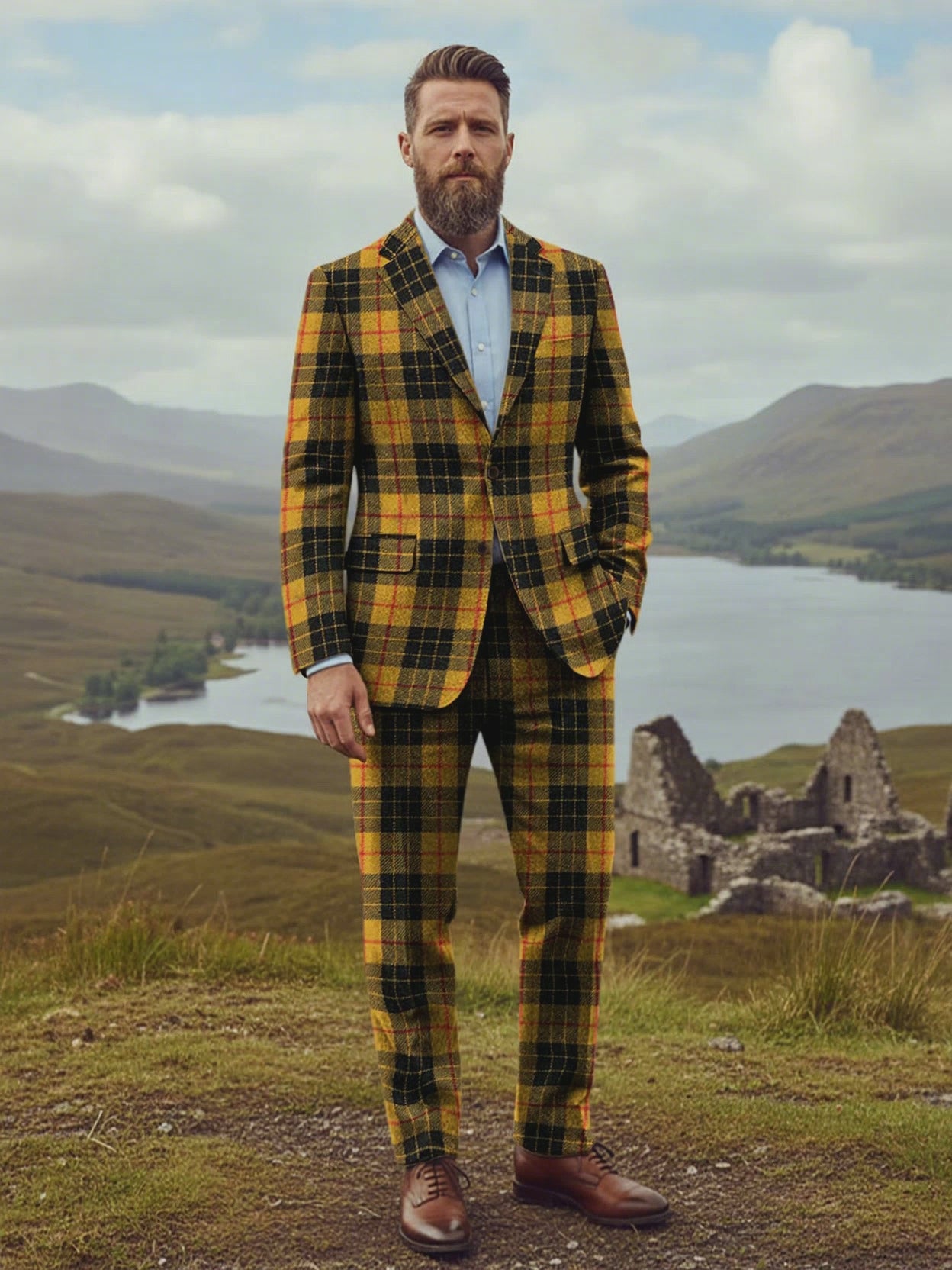 Let the warmth of golden plaid ignite your presence in our Harris Tweed Sunorchid Tartan Suit. Woven from pure hand-crafted wool, its vivid sun-gold base, bold black plaid blocks and sharp red overchecks create a warm eye-catching tartan rich in texture and character. The tailored silhouette delivers sculpted composure and enduring warmth—perfect for distinguished gatherings, countryside celebrations or evenings that call for timeless prestige infused with contemporary charisma.