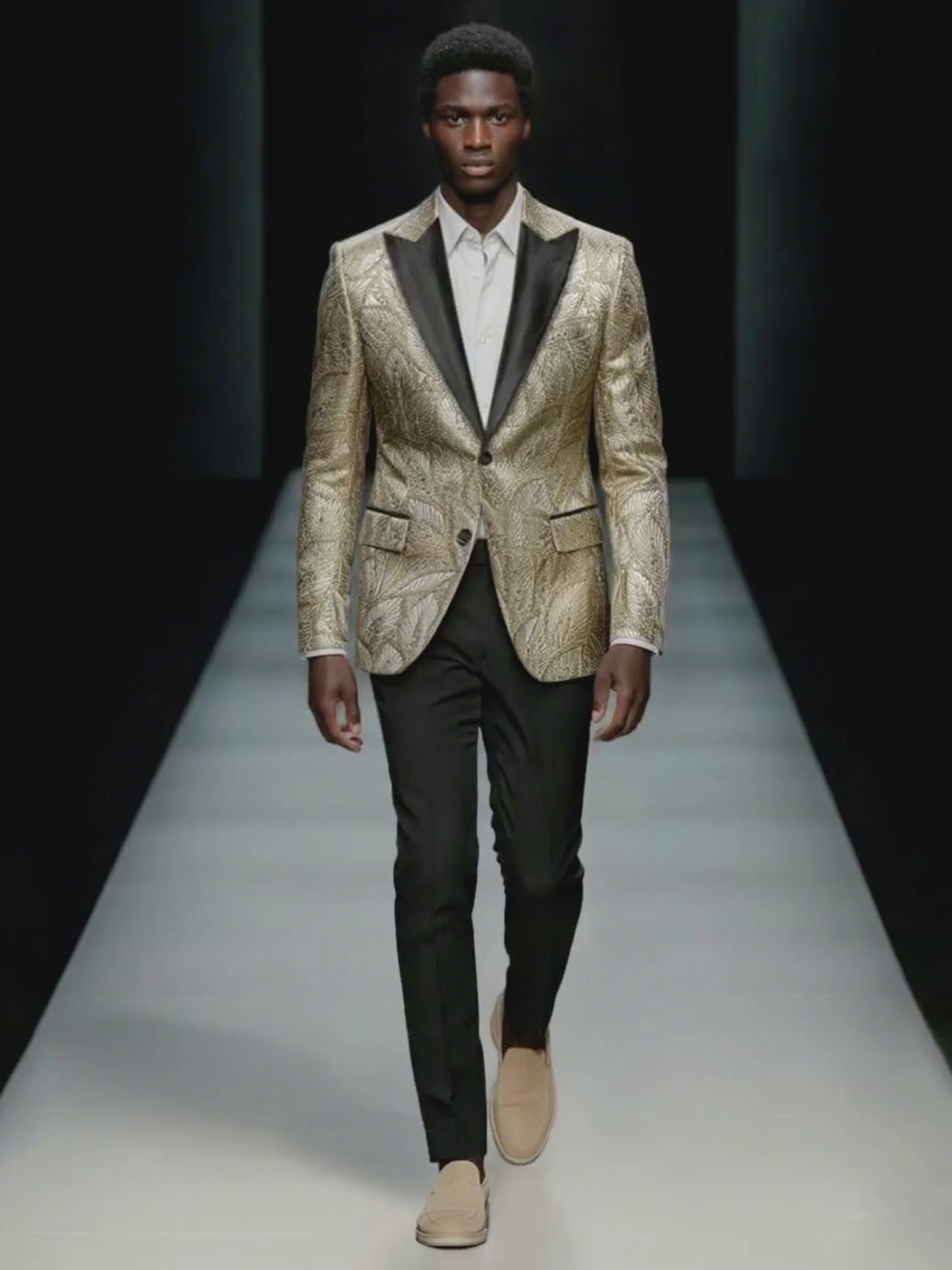 Walk in glowing dunes of pure swagger with every step you take in our Italian Dune Trionfo Tuxedo Suit. Crafted from a premium polyester blend, its opulent dune-inspired brocade shimmers in textured waves of gold and champagne tones. The sculpted fit sharpens your frame, while the bold pattern delivers unmistakable stage presence. Designed for gala nights, red-carpet events, and celebrations where your entrance deserves a standing ovation.