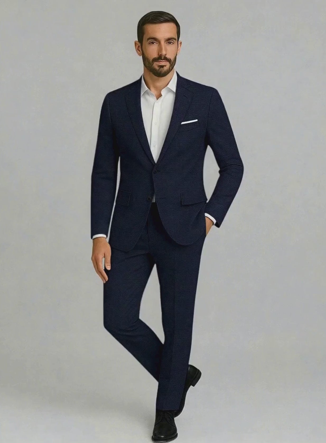 Let confidence settle naturally around you in the Napolean Dalmoro Chevron Weave Royal Blue Suit. Crafted from a smooth wool blend, its deep blue shade and refined chevron texture create a quiet strength - steady, defined, unmistakably modern. Whether you’re stepping into first light or closing out the night, this suit carries a calm authority that will surely moves with you