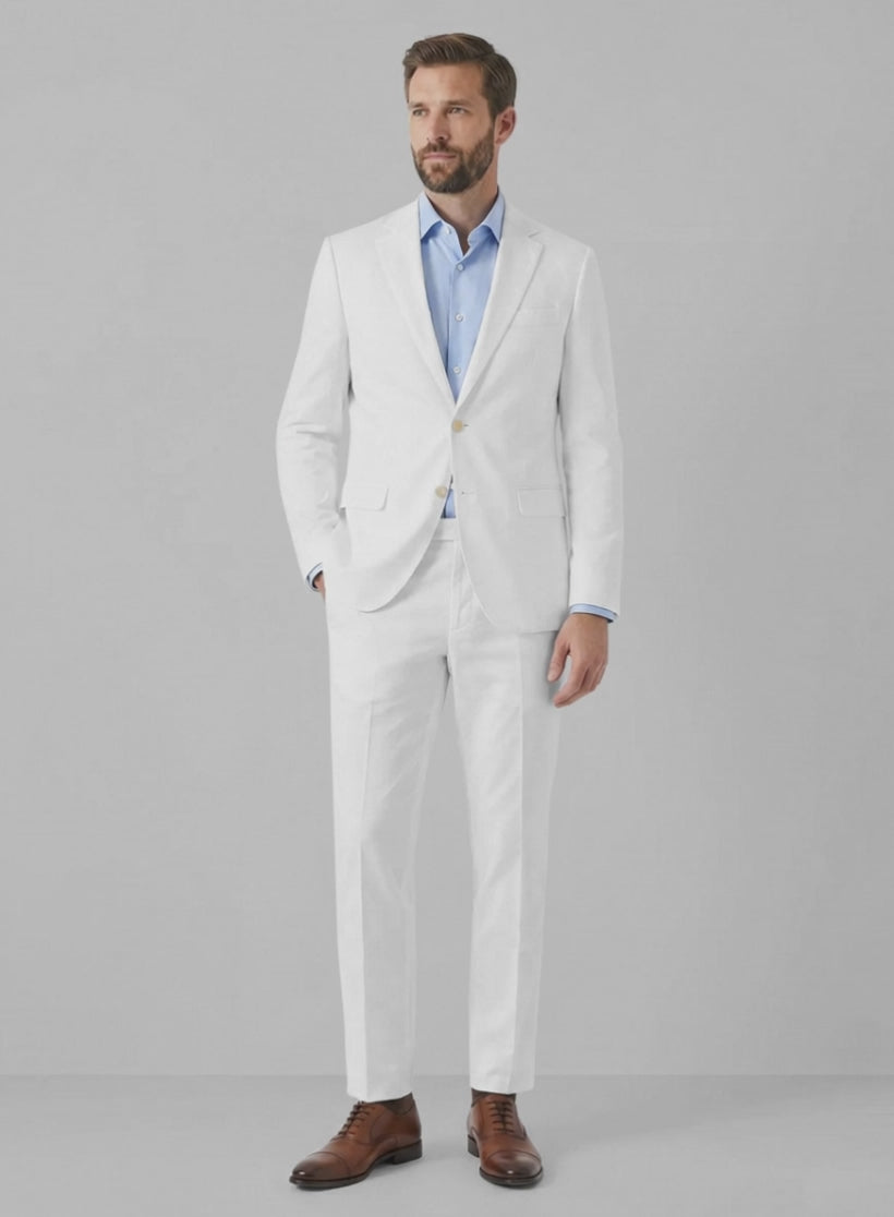 Sunlight seems to gather around it, carrying a presence that feels effortless yet deliberate. Rendered in a pristine summer white, the Stretch Summer White Chino Suit moves with quiet authority, inhabiting moments of warmth, leisure, and unspoken sophistication with a naturally refined ease. Its smooth cotton-lycra blend flows with graceful fluidity, offering breathable comfort and a sense of light, instinctive motion—ideal for sunlit gatherings, evening promenades, and occasions where understated presence speaks louder than words.