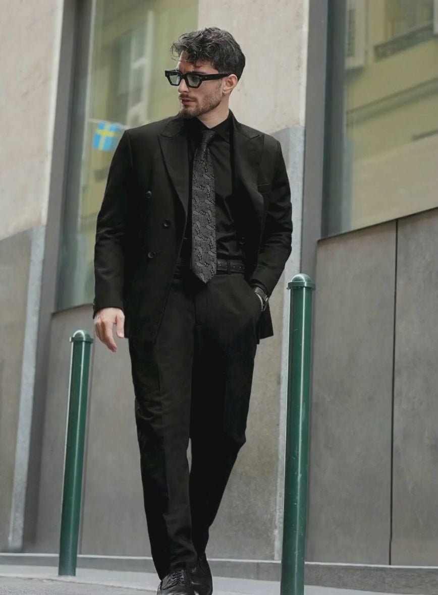 Classic tailoring, elevated in contemporary form in our Black Chino Double Breasted Suit. Impeccably crafted from premium cotton chino, this suit embodies quiet sophistication and modern elegance. Its deep, solid black tone and subtly textured weave lend a sleek, structured silhouette. The double-breasted construction pays homage to heritage tailoring, while the breathable cotton fabric ensures year-round comfort without compromising on refinement. Precision-cut and expertly finished, this suit is ideal for high-powered meetings, evening occasions, or elevated daily wear.