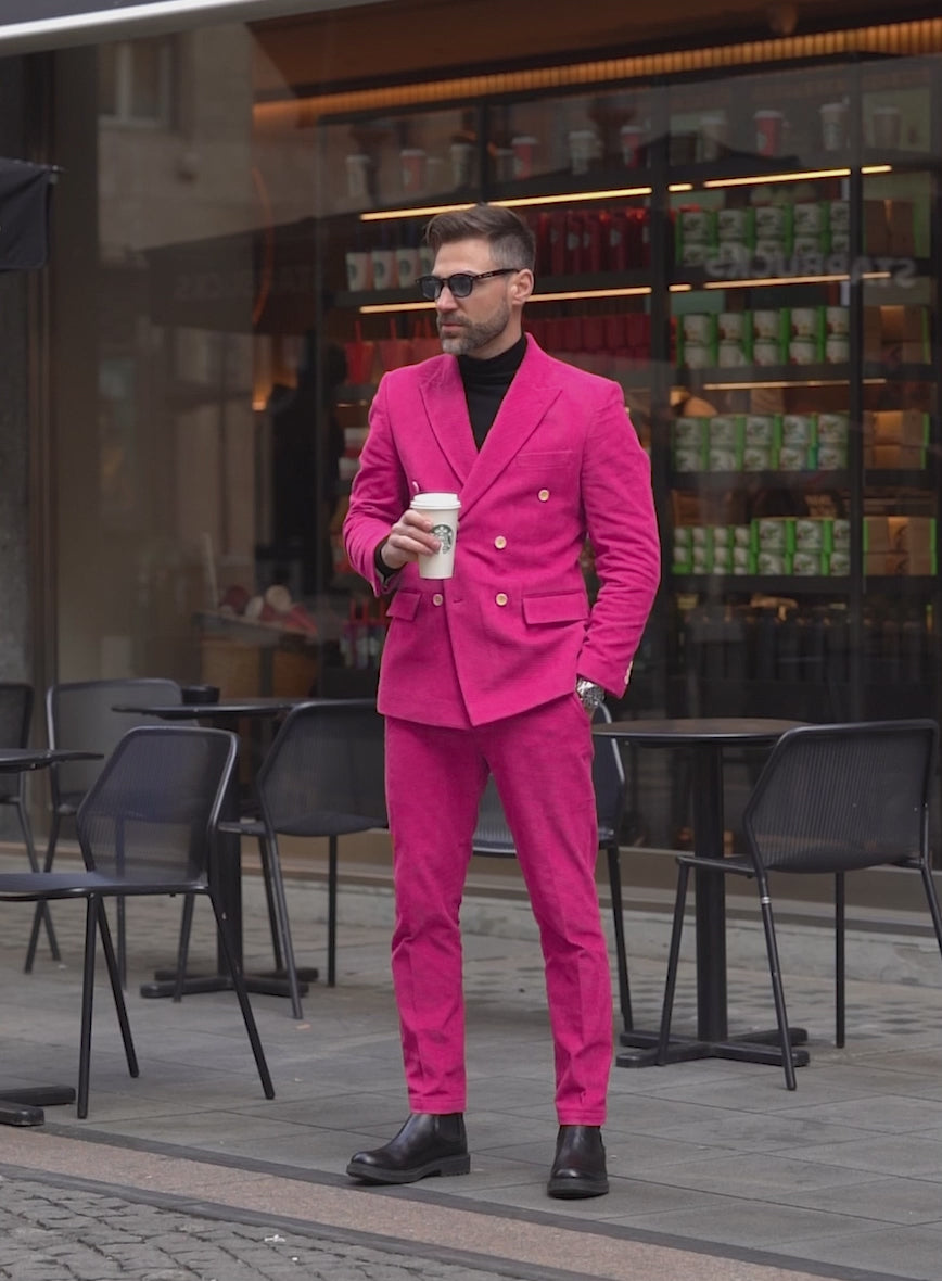 Entice a unique interest by donning our Fusica Pink Corduroy Double Breasted Suit that brews luxurious overtones. First, admire the convenient elegance of our suit, crafted from 100% cotton fabric that features a thick yet intensely smooth, light, and supple arresting stripes texture over a pink shade that delivers your originality bling. Then, mesmerize the gathering with an impeccably tailored pink suit that ensures ultimate comfort for flaunting your distinctive personality without the hassle of showing up at exotic venues and premium events.