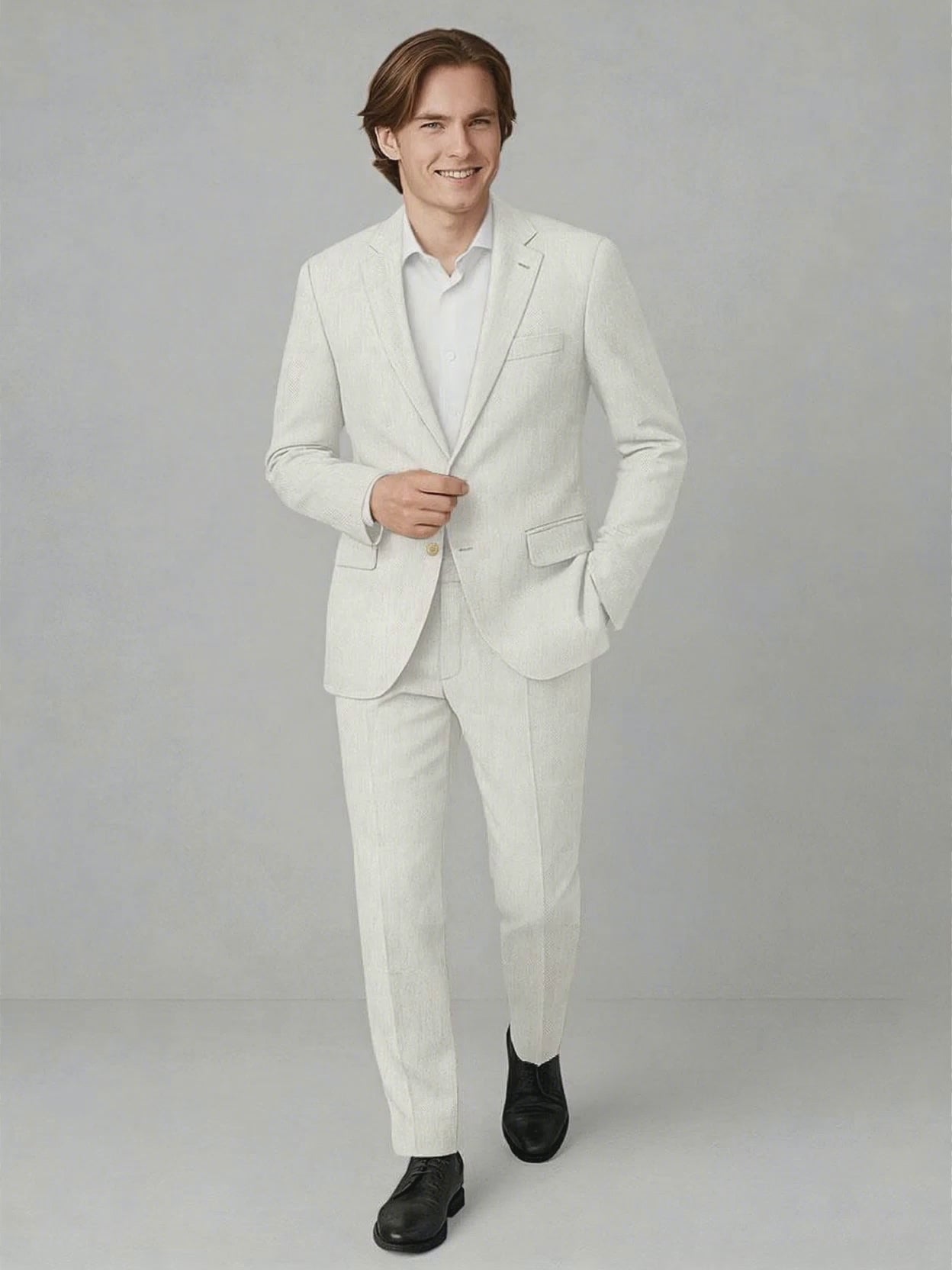 Find your serene stride in our Italian Linen Avorio Herringbone Suit. Woven from premium linen, this ensemble emanates pristine grace and quiet poise. Its soft cream hue, enriched by a delicate herringbone weave, creates a subtle play of texture that mirrors purity and depth. Lightweight, breathable, and timeless, it’s the ideal choice for summer soirées, rooftop gatherings, or destination weddings where serenity meets stature.