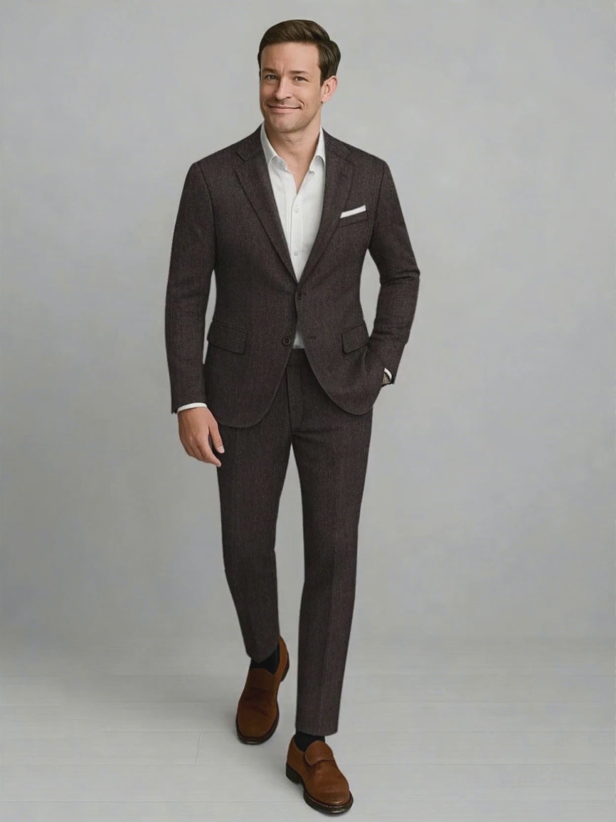 Ascend to the pinnacle of sartorial grace with our Italian Linen Ombro Herringbone Suit. Meticulously woven from the finest, sumptuous linen in a deep espresso-brown hue, its exquisite herringbone weave radiates subtle depth and tactile richness. Impeccably lightweight yet masterfully structured, this suit makes a definitive statement for discerning soirées, exclusive gallery unveilings, or any evening where effortless poise meets contemporary grandeur.