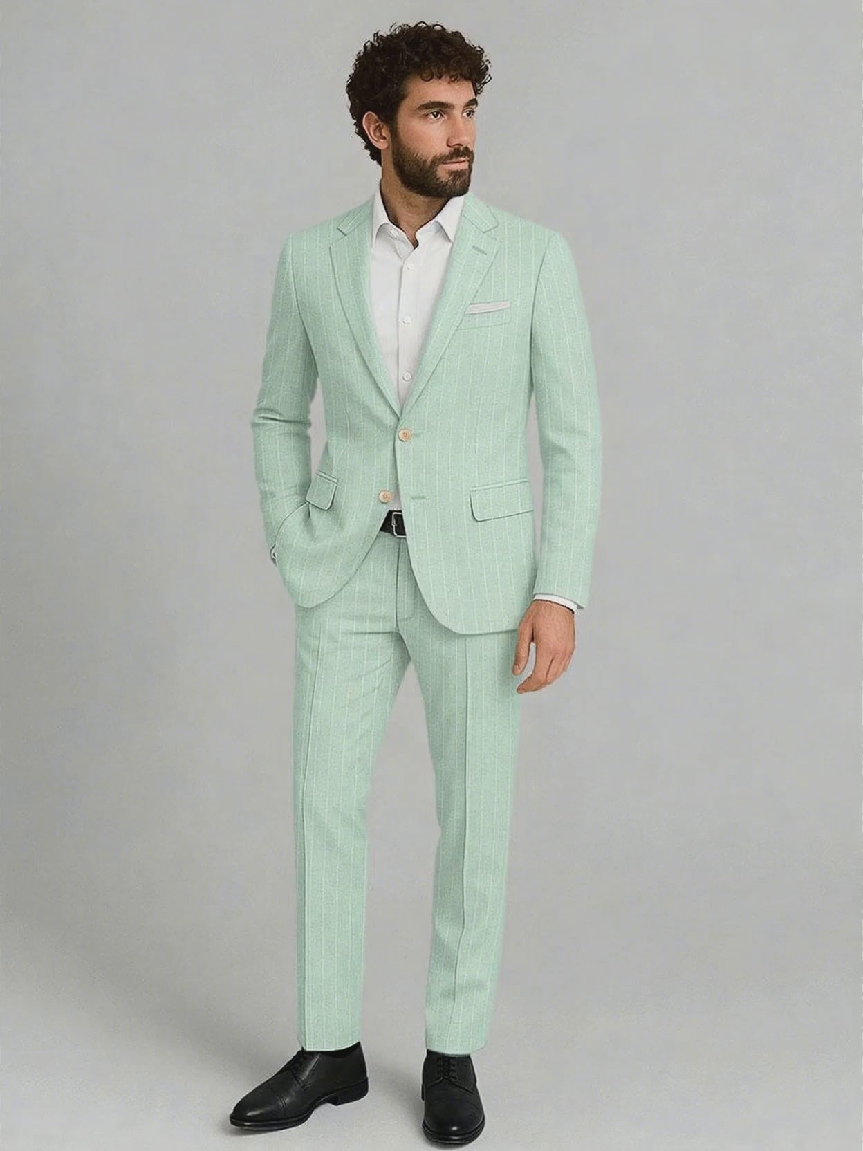 Whispering freshness and finesse, our Italian Linen Pistano Stripe Suit is masterfully tailored from the finest pure linen. Its tranquil mint-green hue is elegantly adorned with subtle vertical stripes that gracefully elongate and refine the silhouette. Lightweight and breathable, it’s the quintessential choice for beachside weddings, alfresco luncheons, or sun-drenched gatherings, occasions that demand a perfect balance of sophistication and playful charm.