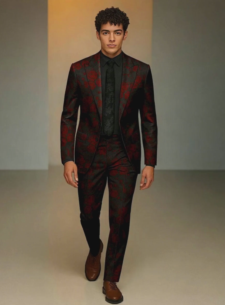 An artful interplay of fabric and form, the Italian Silk Rosaire Suit draws attention with its jacquard rose motif woven into a dark canvas. The blend of silk, poly, cotton, and lycra creates a fabric that is supple yet resilient, offering both comfort and structure. Designed to stand apart, this suit captures drama and sophistication in equal measure, making it a natural choice for evenings that demand presence.