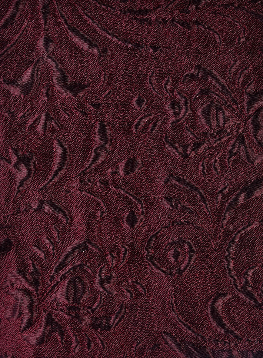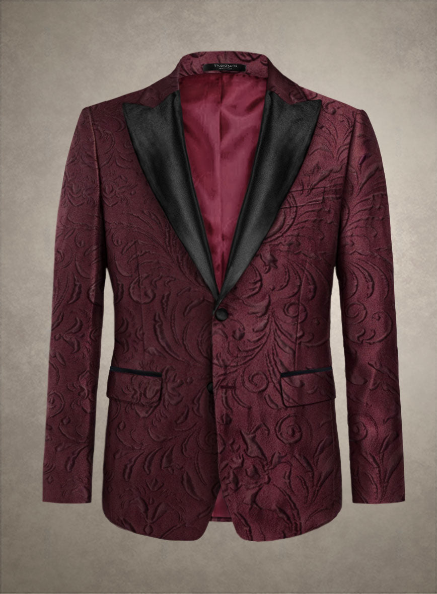 A dance between dusk and dawn, our Italian Wine Ornate Tuxedo Jacket. A statement piece sculpted from a sumptuous blend, it unveils a richly embossed, tapestry-like surface. Bathed in deep wine hues, its ornate pattern flows across a velvety texture, imparting dramatic depth and graceful structure. Smooth against the skin yet undeniably commanding, it is crafted for gala nights, formal receptions, and evenings where distinction is absolute.