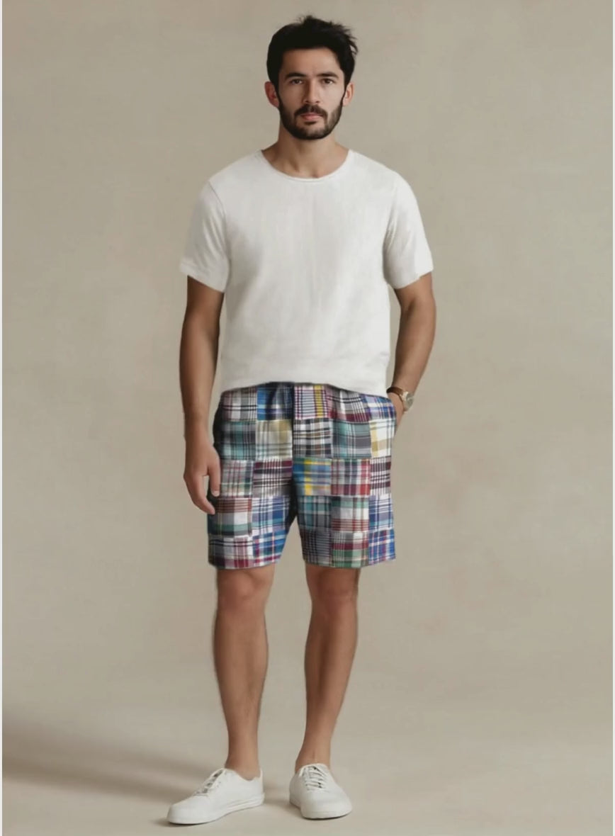 Bring vibrant character to your warm-weather wardrobe with our Madras Patchwork Shorts. Crafted from pure cotton, these shorts are stitched from a lively mix of Madras checks, offering breathability and unmistakable summer flair. A bold statement for beach strolls, weekend brunches, or laid-back rooftop evenings - these shorts combine classic prep with a relaxed modern ...