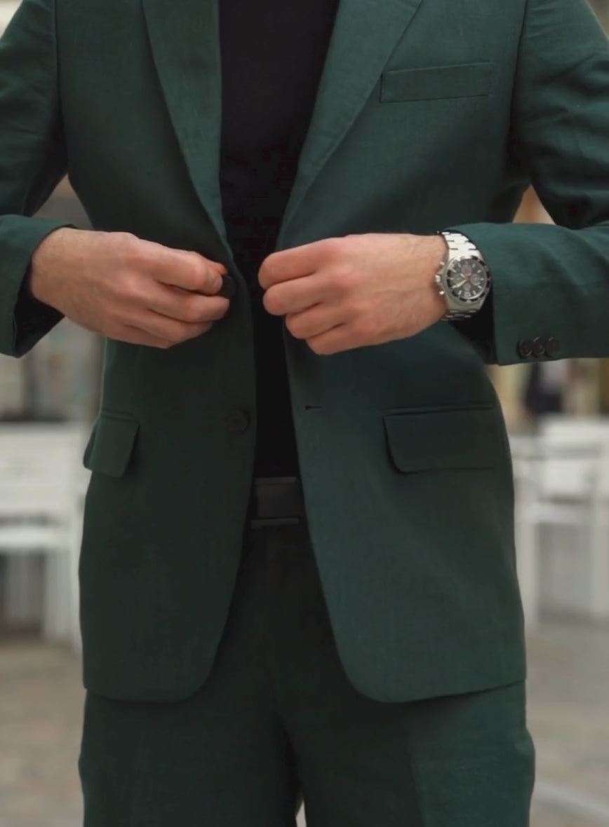 Planning for a resort this summer? Our Martini Green Linen Suit will be a perfect pick because it's not about kidding around when it comes to styling. Crafted from linen, the lightweight summer fabric features a unique slubby texture that will create interest and become the center of attraction. Whether you're attending an elegant soirée, a prestigious wedding, or any occasion where making a statement matters, this jacket is your ultimate companion.