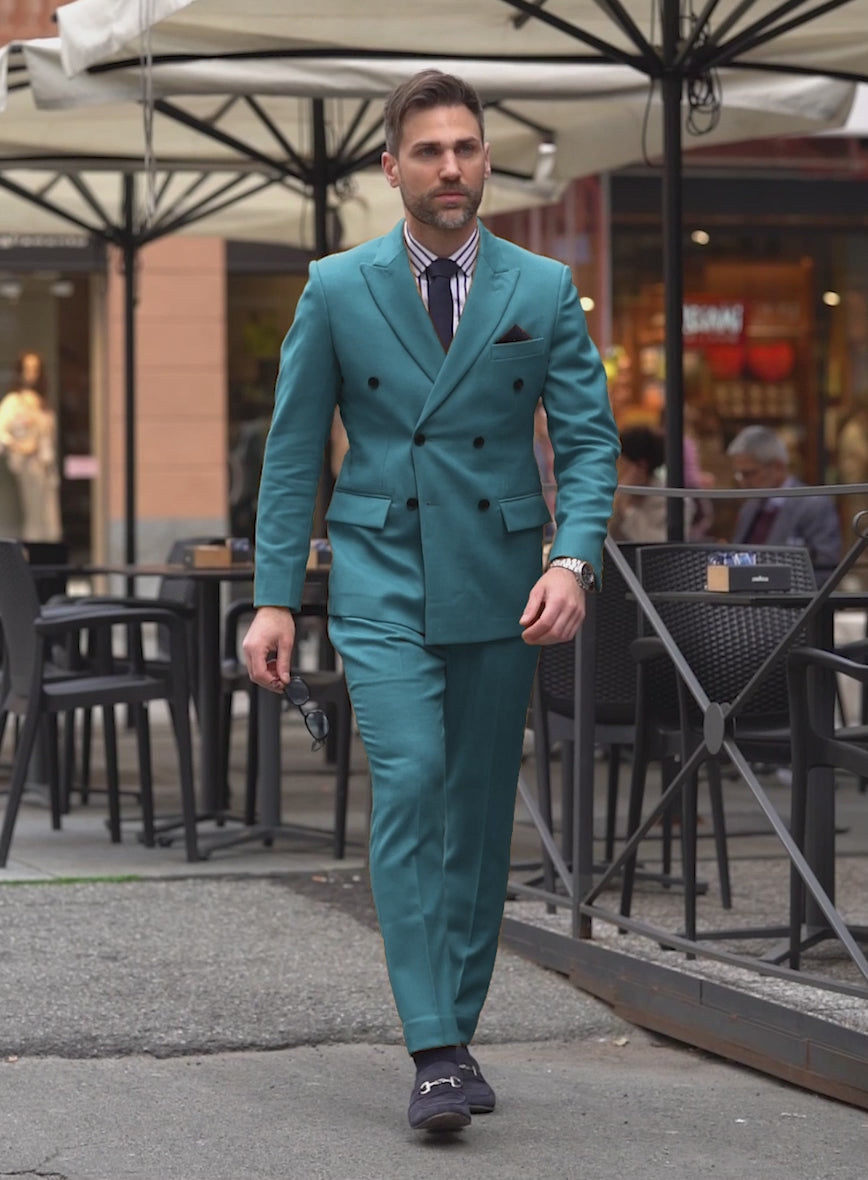 Solidify the vintage elegance by owning our Naples Teal Blue Tweed Double Breasted Suit that channels the glamorous spirit. Besides, our double breasted suit is cut from pure wool fabric, which lays out rich, durable textures that accompanies a delectable feel with a solid blue finish. Moreover, leveling up the sartorial stature teaming with impeccable tailoring helps to conceal ...