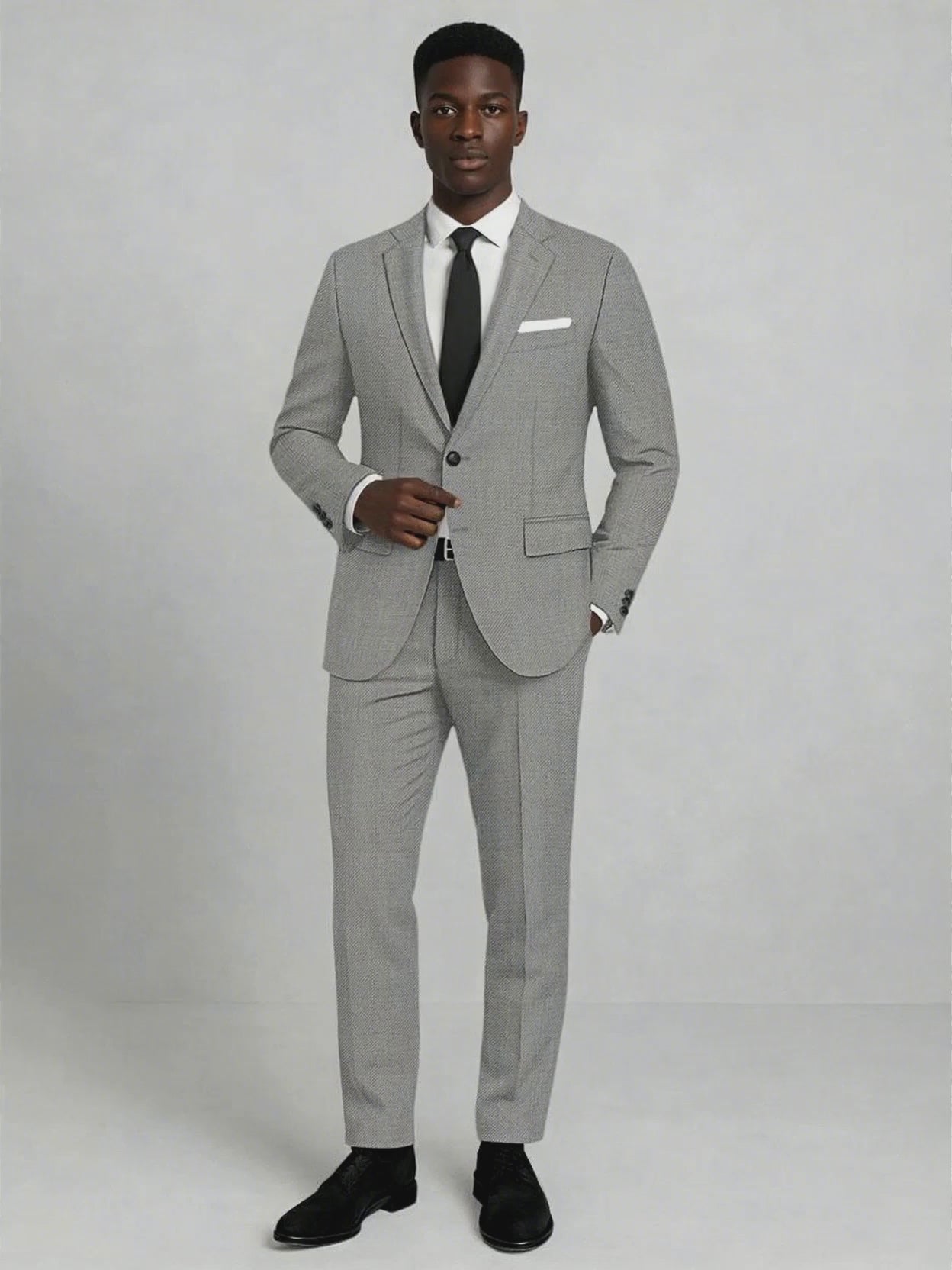 Move through any occasion with confidence in a Napolean Arvett Basket Weave Gray Wool Suit. Premium wool blend shapes a soft, textured silhouette, while the subtle basket weave adds quiet dimension to the solid gray fabric. Clean contours and gentle structure allow natural movement, balancing form and ease for professional days, evening gatherings, or moments that call for refined understatement.
