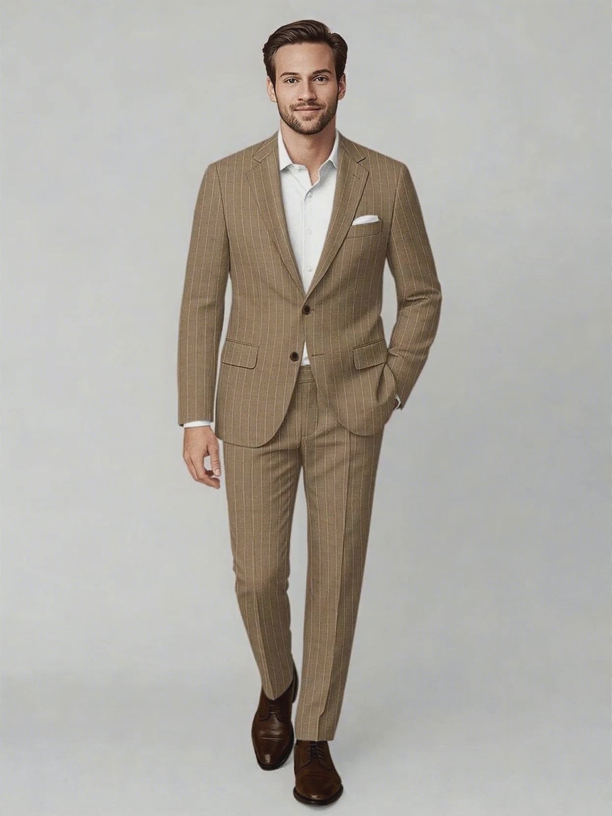 The world slows for those who move with grace in our Napolean Derossi Stripe Beige Wool Suit — an opus of fine wool blend in a sun-kissed beige hue, where slender vertical stripes elongate the form with quiet grandeur, and the fabric’s velvety suppleness and liquid drape evoke a silhouette destined for daytime galas, boardroom triumphs, and soirées bathed in molten golden light.
