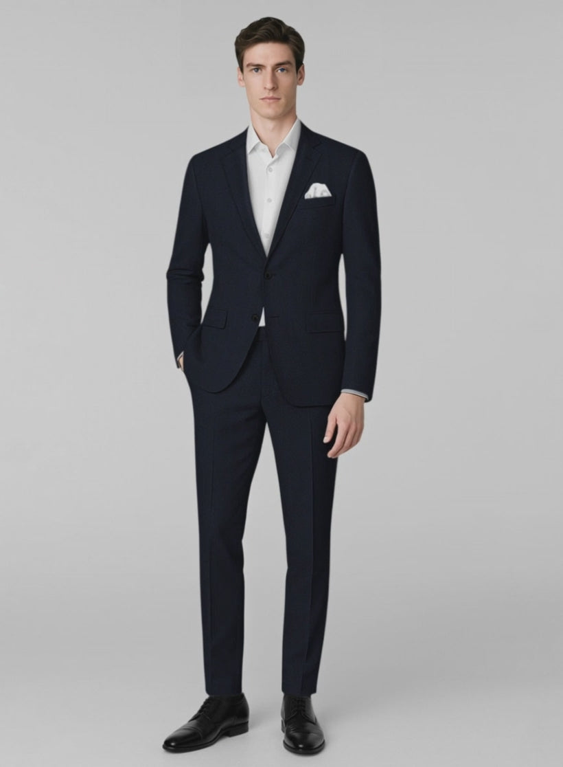 Authority takes shape in silence, our Napolean English Twill Dark Blue Wool Suit is fashioned from a refined wool blend that masterfully balances sculpted structure with fluid comfort. The deep dark-blue tone and smooth twill texture reveal a clean and solid design layered with quiet depth and modern distinction. Poised yet effortless, it is tailored for decisive meetings, formal occasions, and evenings where confidence is expressed with restraint and intention.