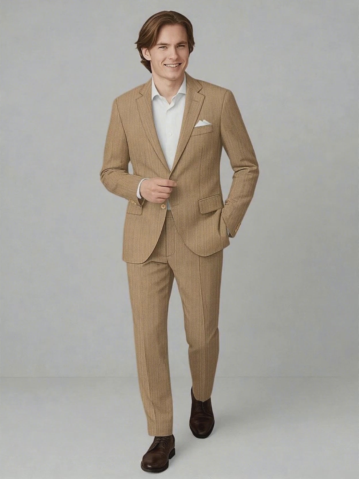 Honeyed threads entwined with rhythm and refinement in our Napolean Lurvani Herringbone Biscotti Wool Suit. Impeccably tailored from a luxurious wool blend, this sartorial masterpiece reveals a warm biscotti-brown hue enriched by a subtle herringbone pattern that dances gently with the light. The fabric’s soft texture and fluid drape embody understated opulence, making it the perfect choice for daytime receptions, destination weddings, or autumn soirées—where grace and confidence coexist in seamless harmony.