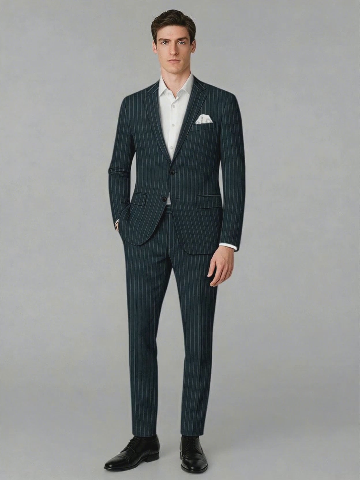 A portrait of precision woven in dark allure — the Napolean Oresto Stripe Dark Blue Wool Suit redefines tailored supremacy. Spun from a fine wool blend, this masterpiece reveals a deep navy canvas etched with immaculate white stripes that echo authority in restraint. The fabric’s sleek texture merges structure with fluid grace, embodying the perfect equilibrium between discipline and distinction. Ideal for power-charged boardroom moments, or elite affairs where sophistication transcends appearance and becomes presence itself.