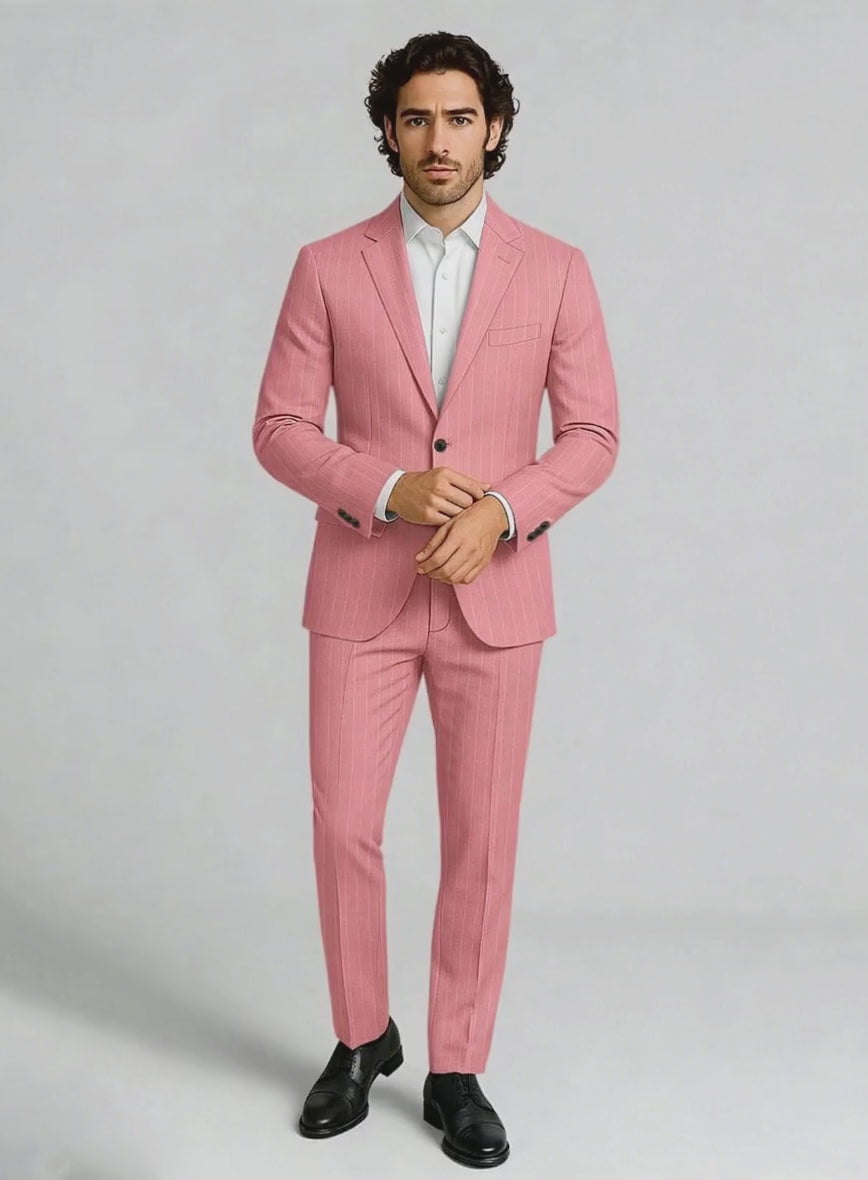 Power dressing gets a playful twist in petal pink with our Napolean Petalo Stripe Pink Wool Suit. Tailored from a sumptuous wool blend that unites softness with enduring structure, its radiant pink foundation accented by crisp white stripes transforms classic tailoring into a statement of modern prestige. Sculpted to create a silhouette that merges bold character with graceful poise, this suit is designed for summer weddings, destination soirées, and commanding business occasions—an emblem of contemporary luxury with a spirited edge.