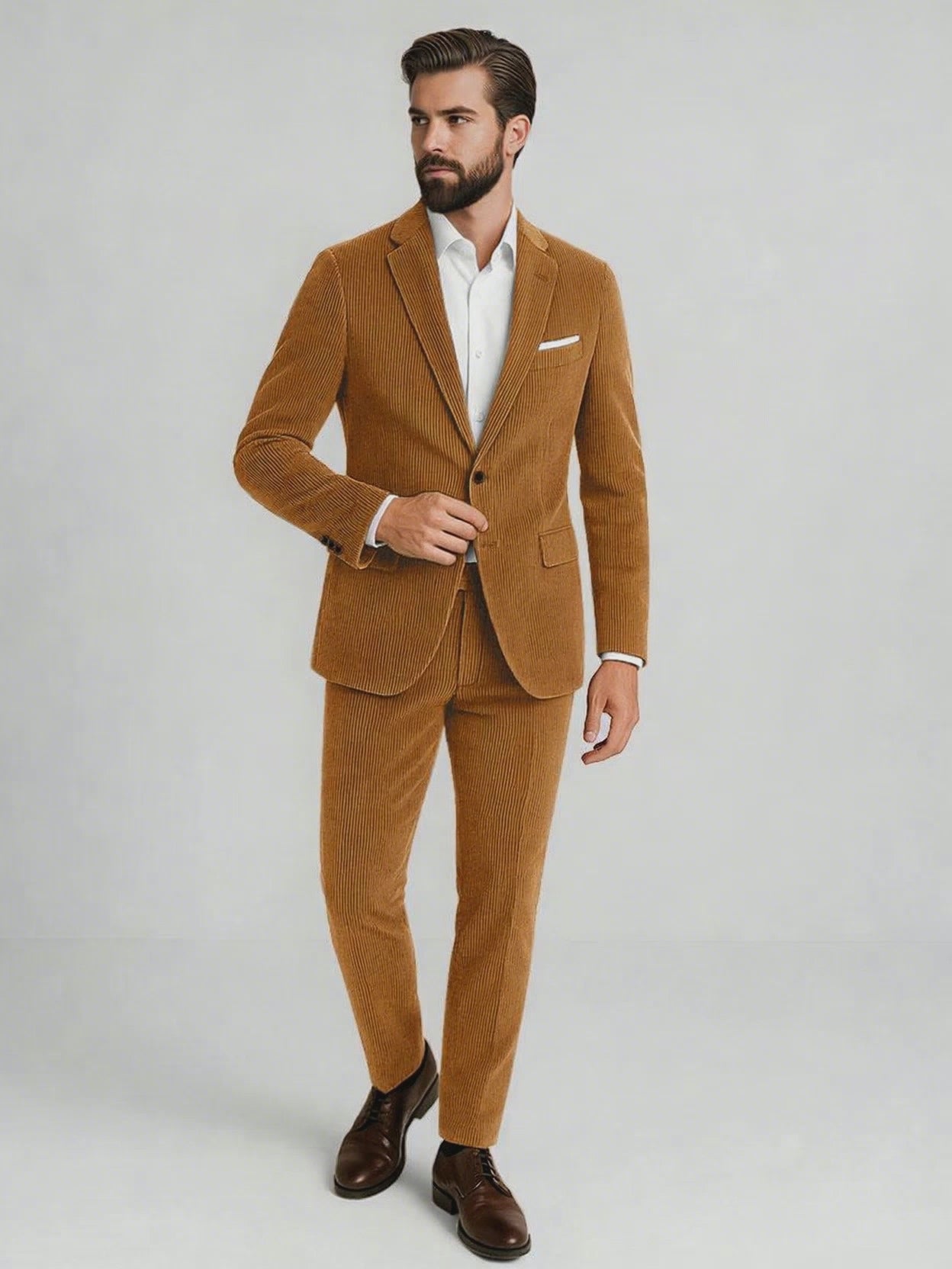 Gear up to conquer every spotlight moment with our Tan Corduroy Suit. Meticulously handcrafted from pure cotton, the plush corduroy fabric showcases its velvety ridges, radiating textural brilliance. The warm tan hue blends earthy calm with urban charisma, making it the perfect pick for suave soirées or easy-breezy daytime affairs. This masterpiece doesn’t just dress you, it defines you. So step out, own your vibe, and let your confidence take center stage!