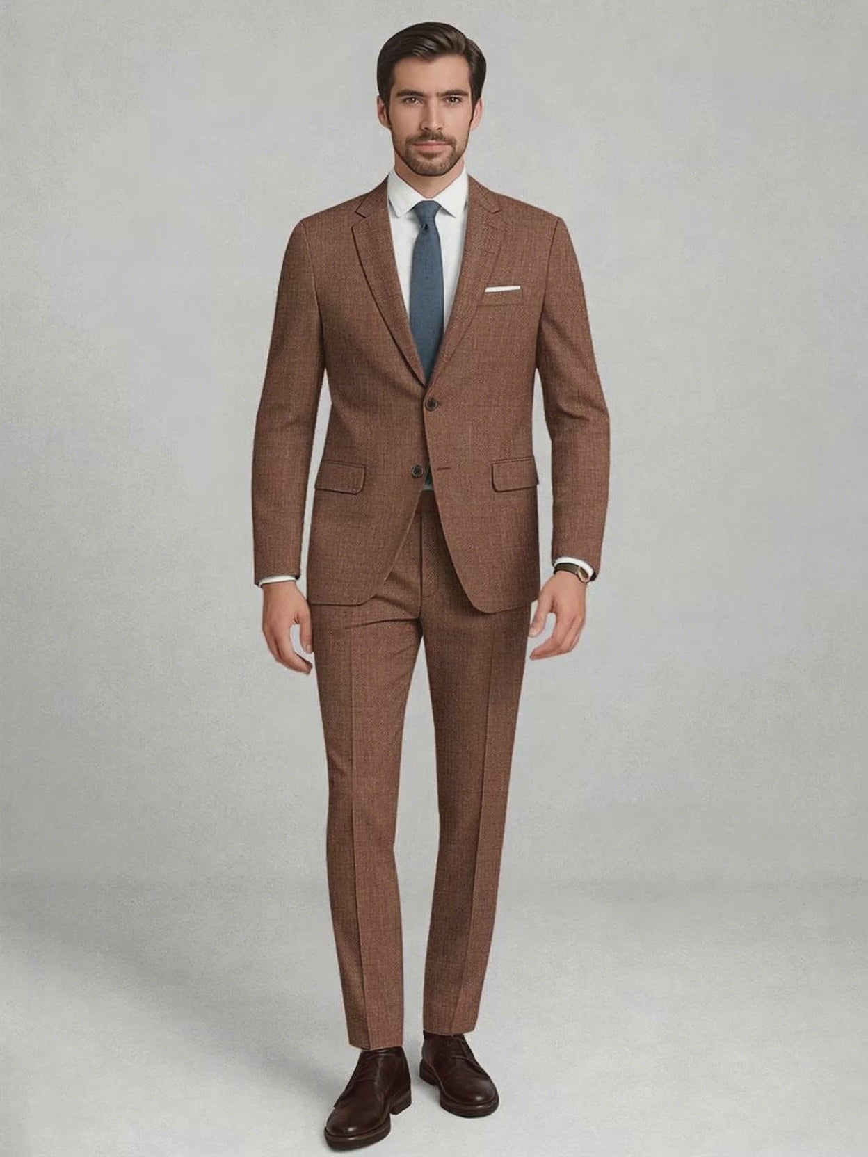 Grounded in timeless character, the Walnut Brown Hopsack Suit is tailored from pure wool in a textured weave that balances structure with breathability. Its walnut tone brings warmth and quiet distinction, while the hopsack finish lends a natural rhythm to the surface. Comfortable yet composed, it shifts seamlessly from professional settings to evening engagements with enduring assurance.