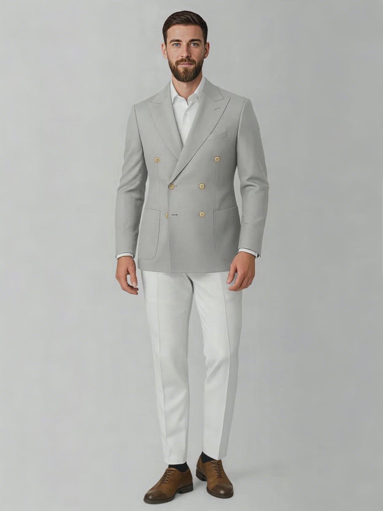 Reshape the very essence of understated luxury with our White Light Gray Cotton Double-Breasted Suit. A masterpiece where modern precision meets timeless poise. Draped in whisper-soft pale gray, its sleek cotton surface exudes quiet allure, while gilded buttons add a touch of regal charm. Perfect for sun-drenched soirées, seaside vows, or starlit rooftop revelries, this ensemble reimagines simplicity as a symphony of refined statement style.