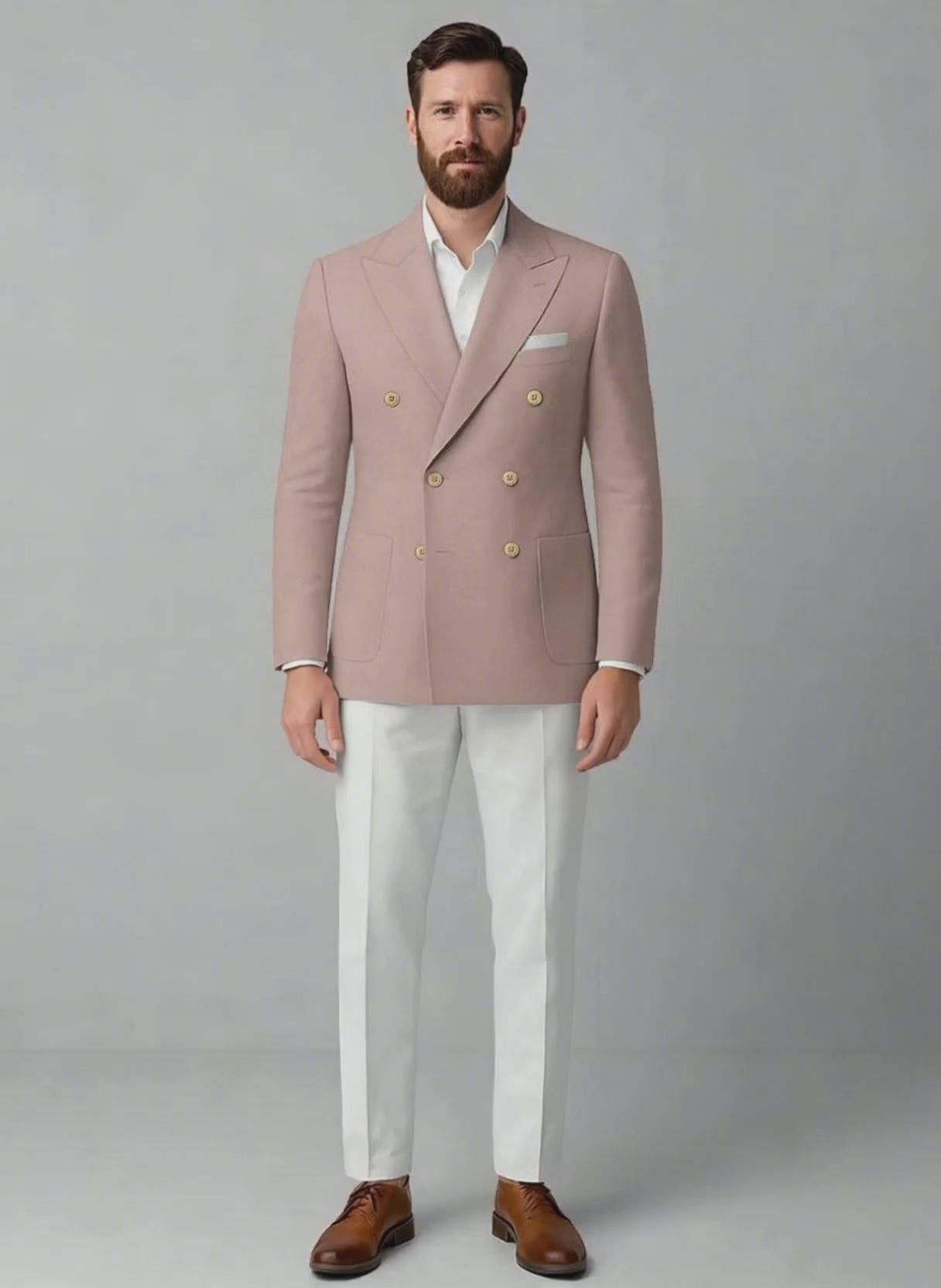 An interplay of serene white and muted mauve finds its finest expression in the White Light Mauve Cotton Double Breasted Suit. Exquisitely tailored from a refined cotton blend, this creation unveils a sophisticated solid canvas where crisp white seamlessly harmonizes with soft light mauve, composing a palette of quiet distinction. The double-breasted architecture, crowned with sharp peak lapels, embodies timeless authority while the breathable weave offers a fluid balance of comfort and structure. Perfect for summer weddings, destination soirées, and cultured evening affairs, this suit transcends occasion to become a symbol of understated power and effortless charm.