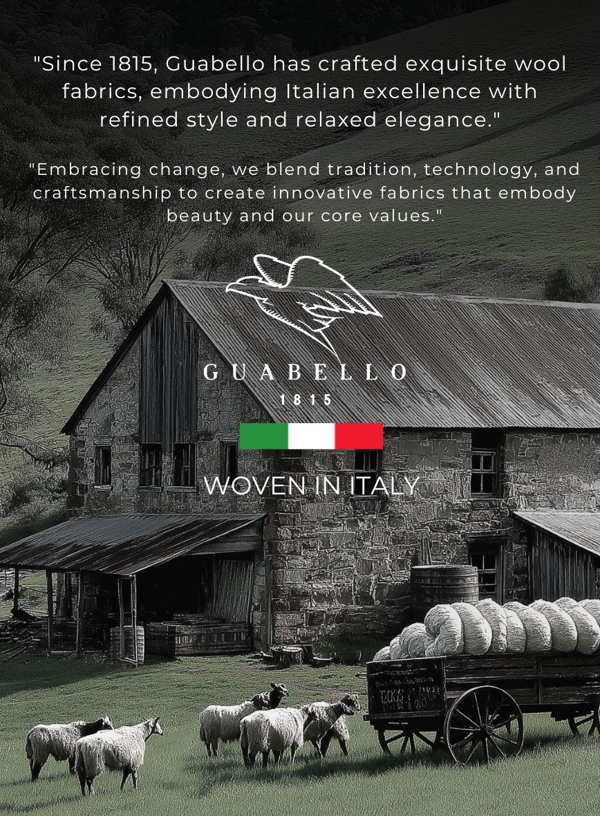 About Guabello: Guabello is a prestigious Italian textile house with over two centuries of expertise in fine wool fabrics. Established in 1815, it seamlessly merges heritage with modern advancements, producing exceptional, eco-conscious materials for high-end fashion. Rooted in artistry and innovation, it stands for sophistication, precision, and enduring excellence.